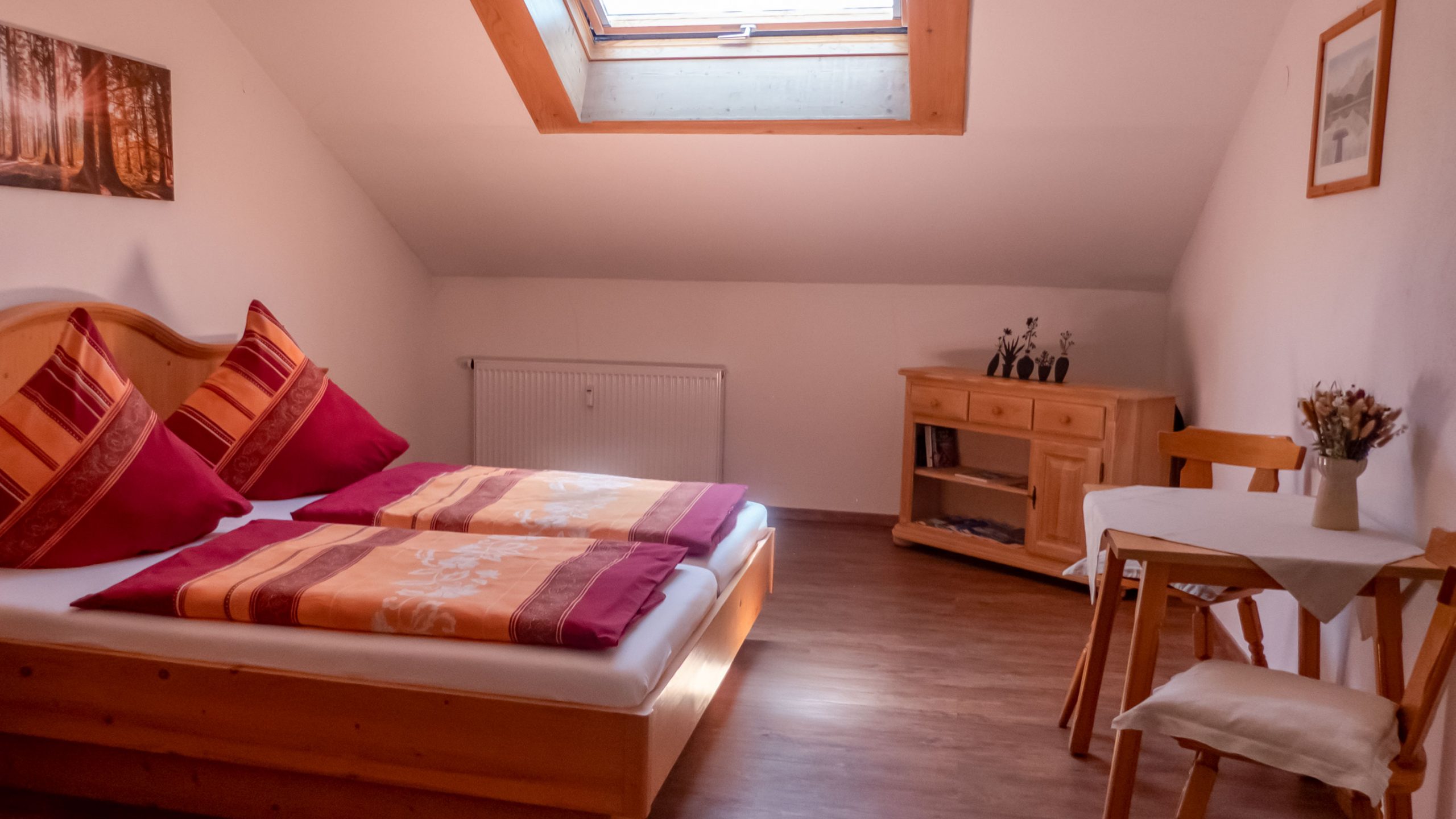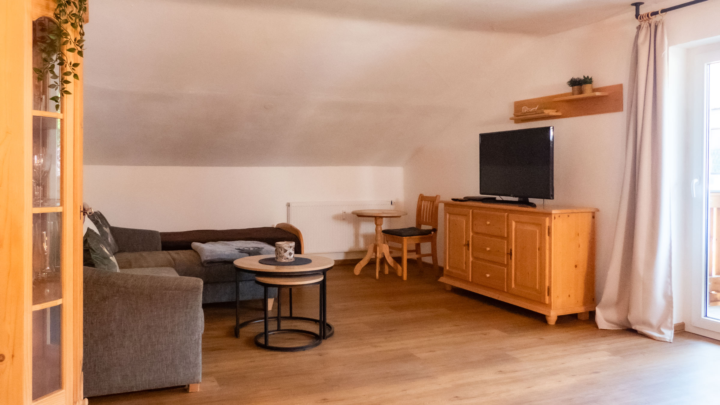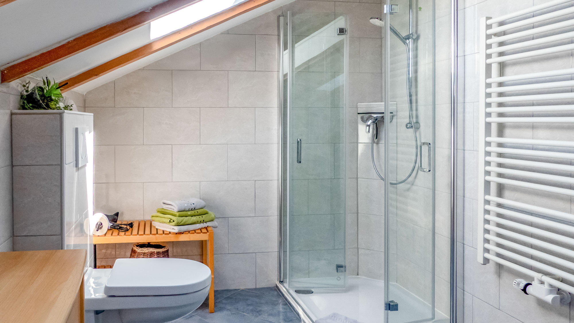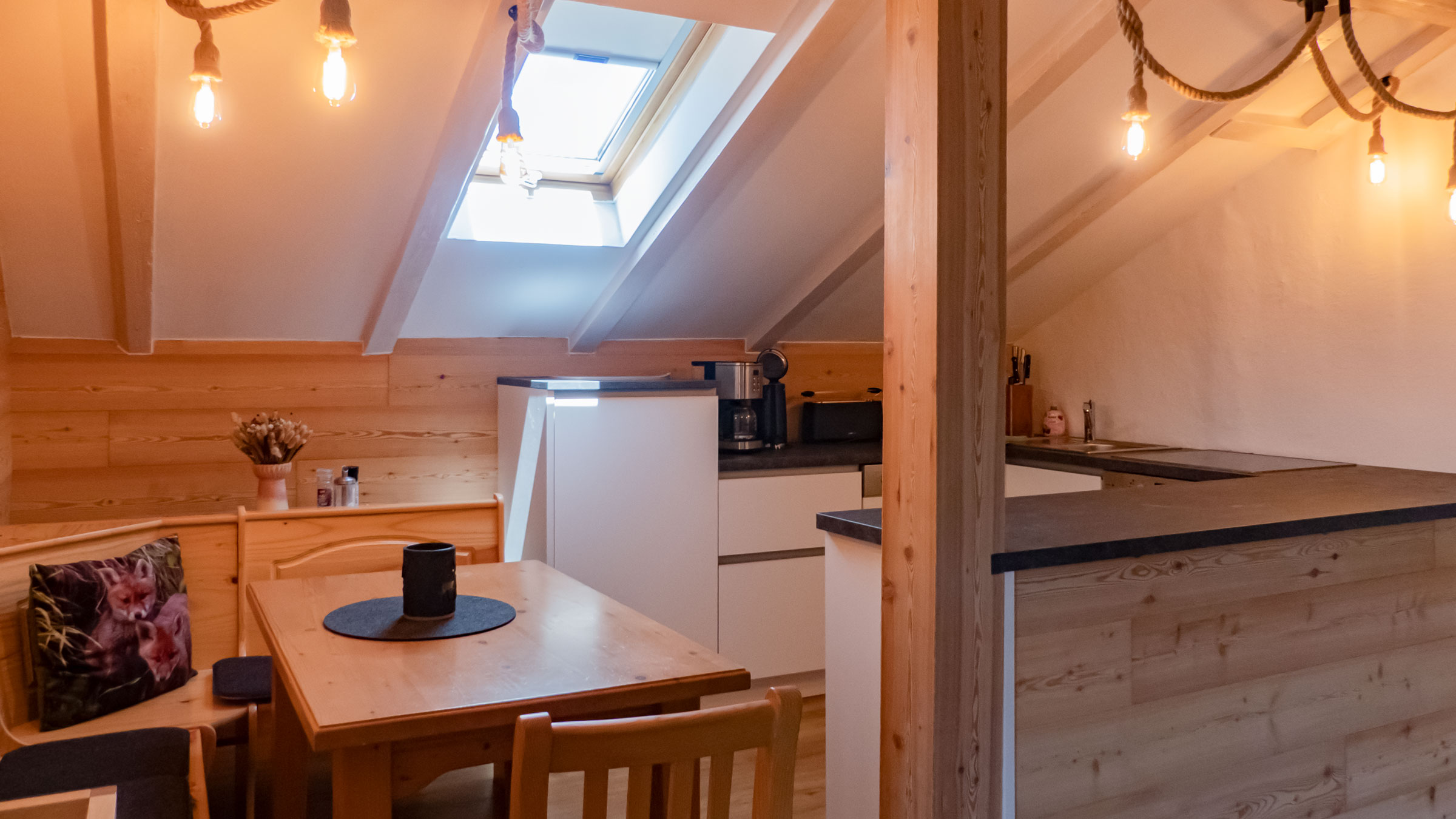 Unsere Dachgeschosswohnung Gipfelstürmer im 2. Stock bietet über 80 m² Wohnkomfort mit zwei separaten Schlafzimmern, einer voll ausgestatteten Küchenzeile, Bad mit fast ebenerdiger Dusche und einem großen Wohnzimmer mit Zugang zum sonnigen Südwest-Balkon.